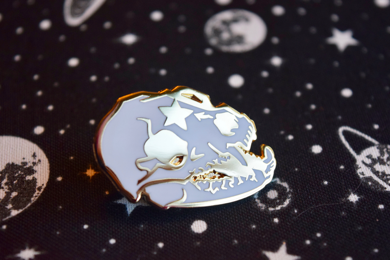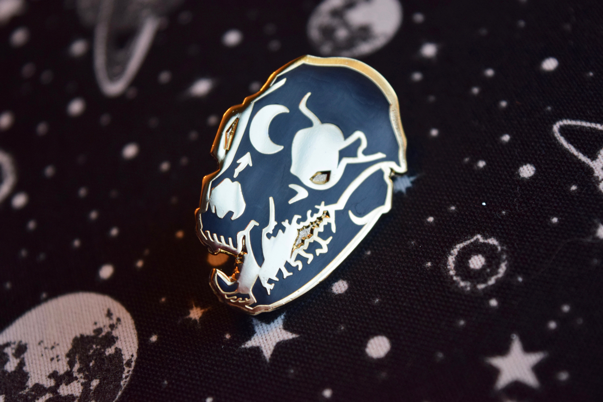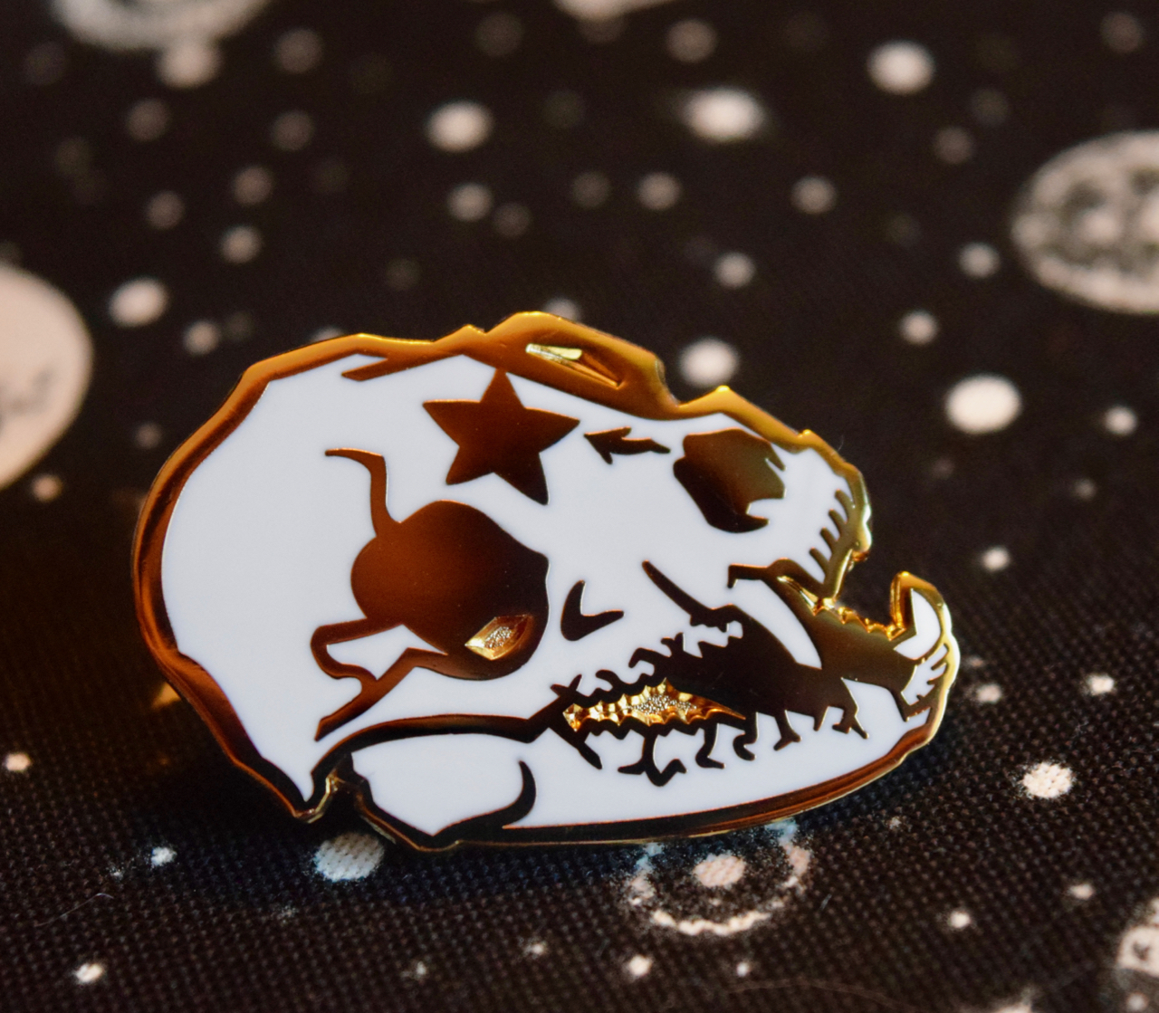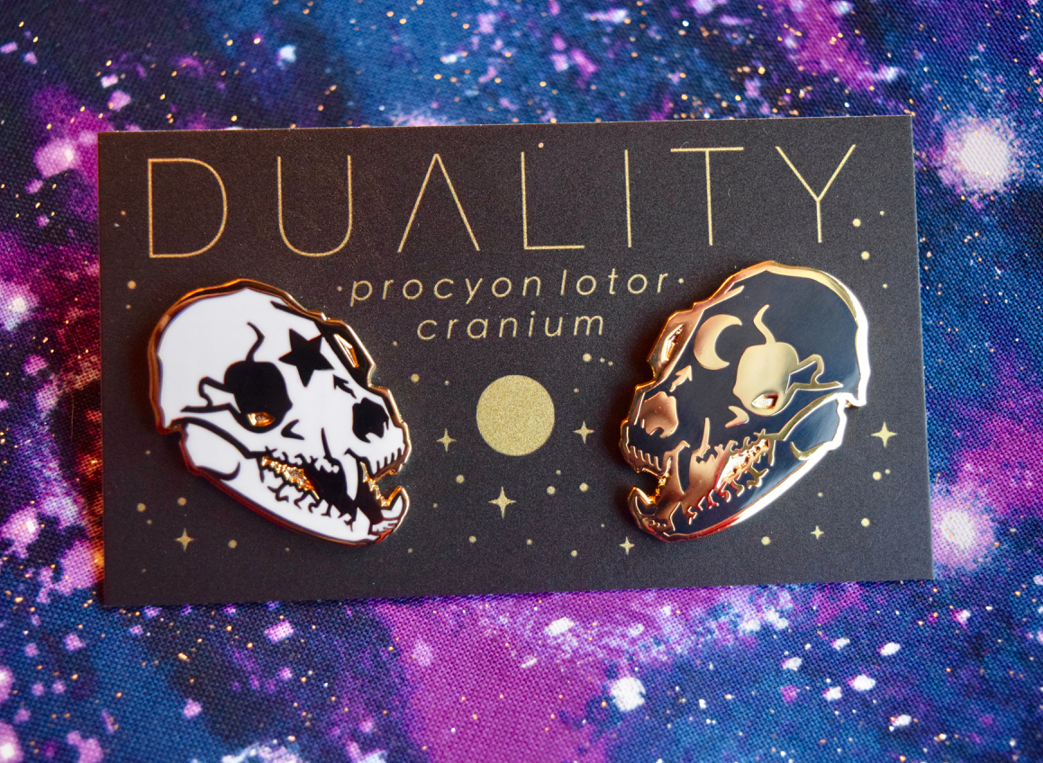this set of two raccoon skull pins features hard enamel and a gold finish. each pin is 1.25" and each includes one rubber back.